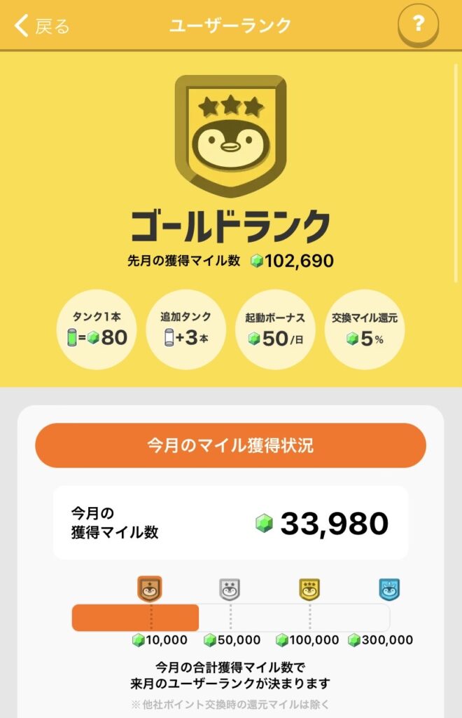 ランクが上がると、タンク上限アップ・起動ボーナス増・交換マイル還元などの特典があります。