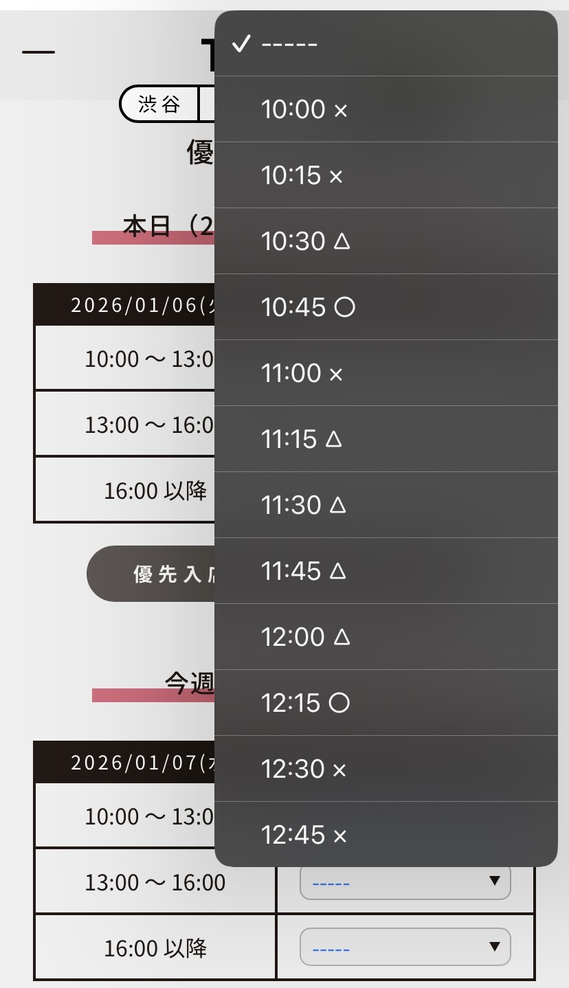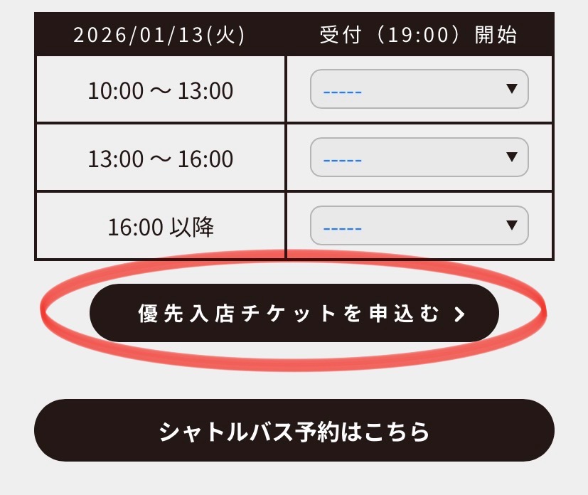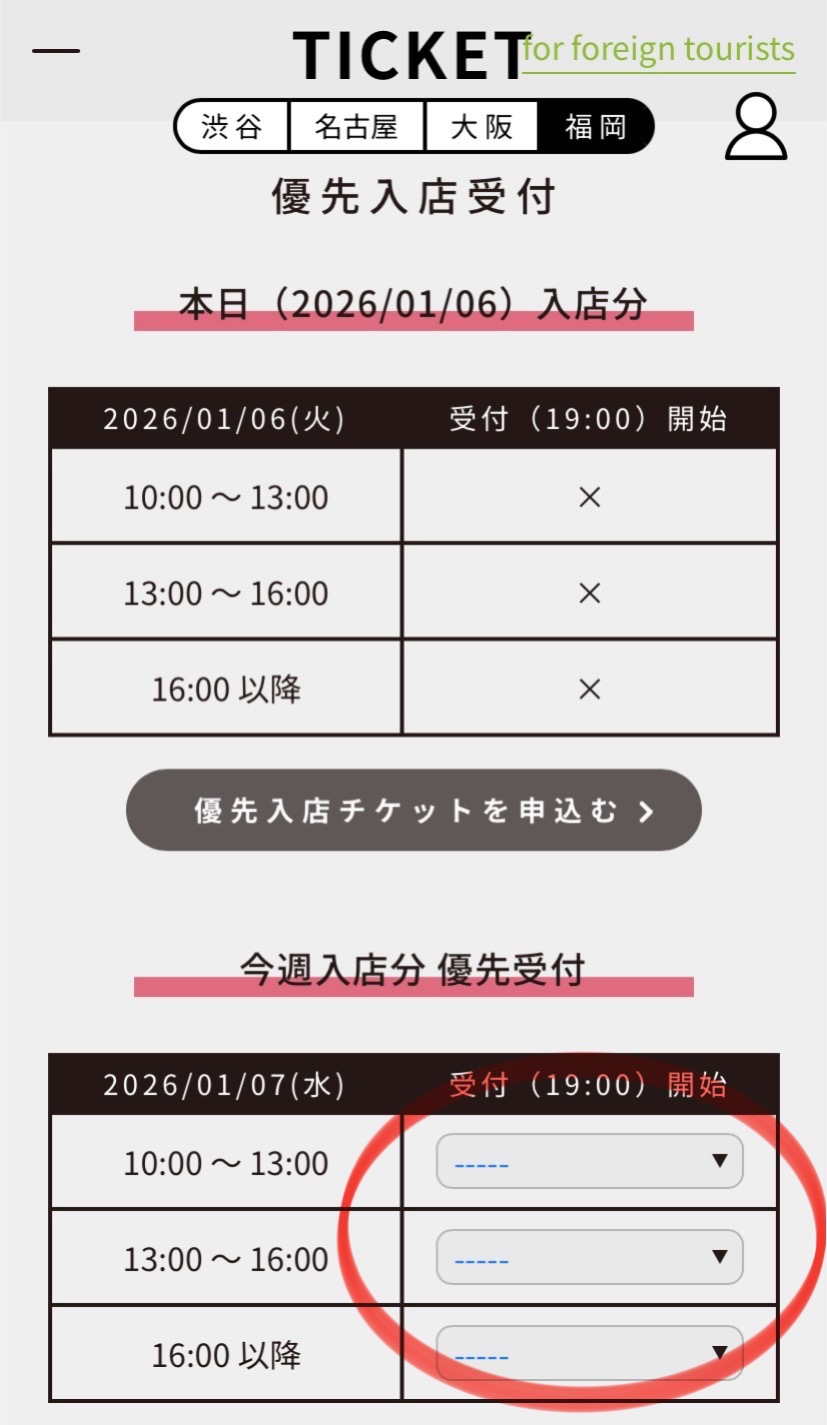 店舗や日程によっては、優先入店チケットの予約が取りづらいこともあります。