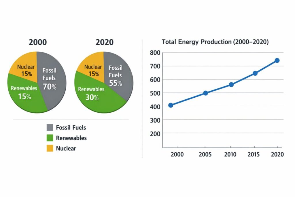 Regarding total energy production, the overall output grew significantly from 2000 to 2020. This upward trend is consistent with the increasing share of renewable energy, suggesting that the growing demand was increasingly met by alternative sources.