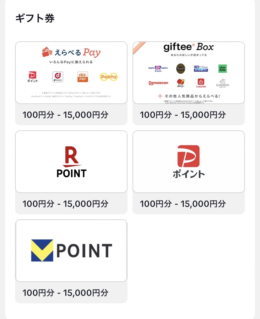 ギフト券一覧が表示されるので、交換したい電子マネーやギフト券を選択します。(PayPayを選択)
