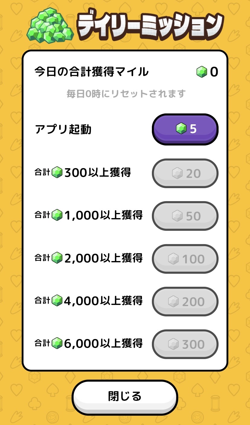 引用:トリマソリティアアプリ(筆者編集スクリーンショット) - クリアでためたマイル数に応じて「デイリーミッション」のマイルもゲット